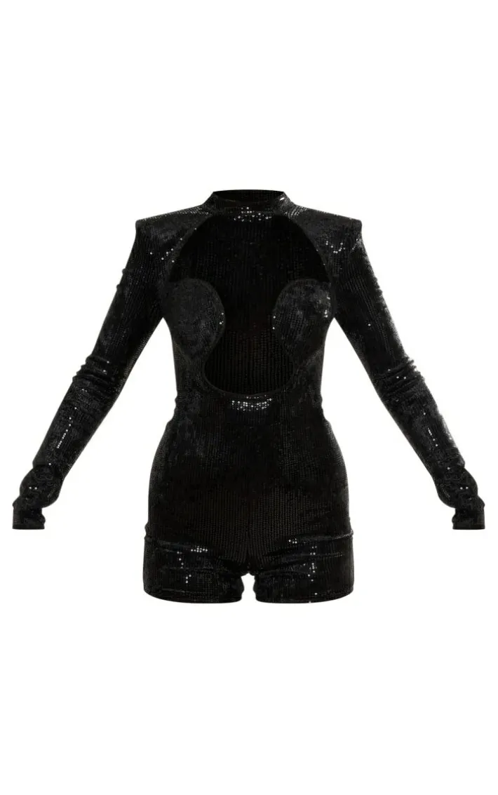 Make a statement this weekend with this black sequin velvet wire detail cut-out long sleeve romper. Made from a black sequin velvet material with a cut-out design, and wire detail, how could you not be obsessed? Perfect for when you want to be the center of attention, this romper is calling your name. Style seamlessly with silver accessories and statement heels for a dreamy finish that won’t go unnoticed.