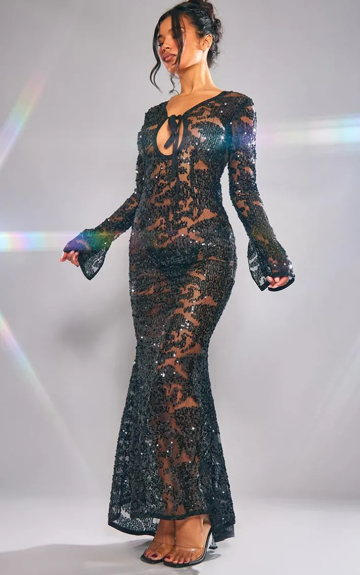 When the weekend calls for a little drama this black sheer sequin long sleeve tie front maxi dress will have you at the center of attention. It is made using a black sheer material with sequin detail, long sleeves and a tie front, what more could you want ? Style this with clear slip-on heels and statement accessories to elevate the look further.