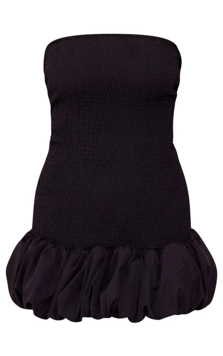 Make everyday styling look effortlessly chic with this black shirred bandeau bodycon dress. Brought to you in a black material with a shirred design, a bandeau neckline and a puffball hem, what’s not to love? Style this bodycon dress with sandals and simple gold accessories for a look that is sure to have all eyes on you.