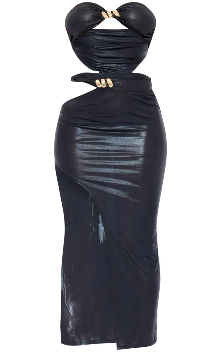 Bring all the drama to your weekend plans in this black slinky cut out hammered trim midi dress. Brought to you in a black slinky material with a cut out design and hammered trim detailing for that extra touch of glam, we are obsessed. Style this midi dress with heels and gold accessories for a look that is sure to turn heads wherever you go.