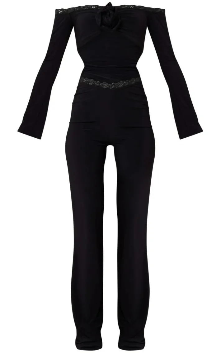 Steal the stares for all the right reasons in this black slinky lace cut out corsage bardot jumpsuit. Brought to you in a black hue slinky material with a bardot neckline, a cut out design and lace corsage detailing for that extra touch of glam, how can you resist? Style this black jumpsuit with your highest heels and glam accessories for a look we just can’t get enough of.