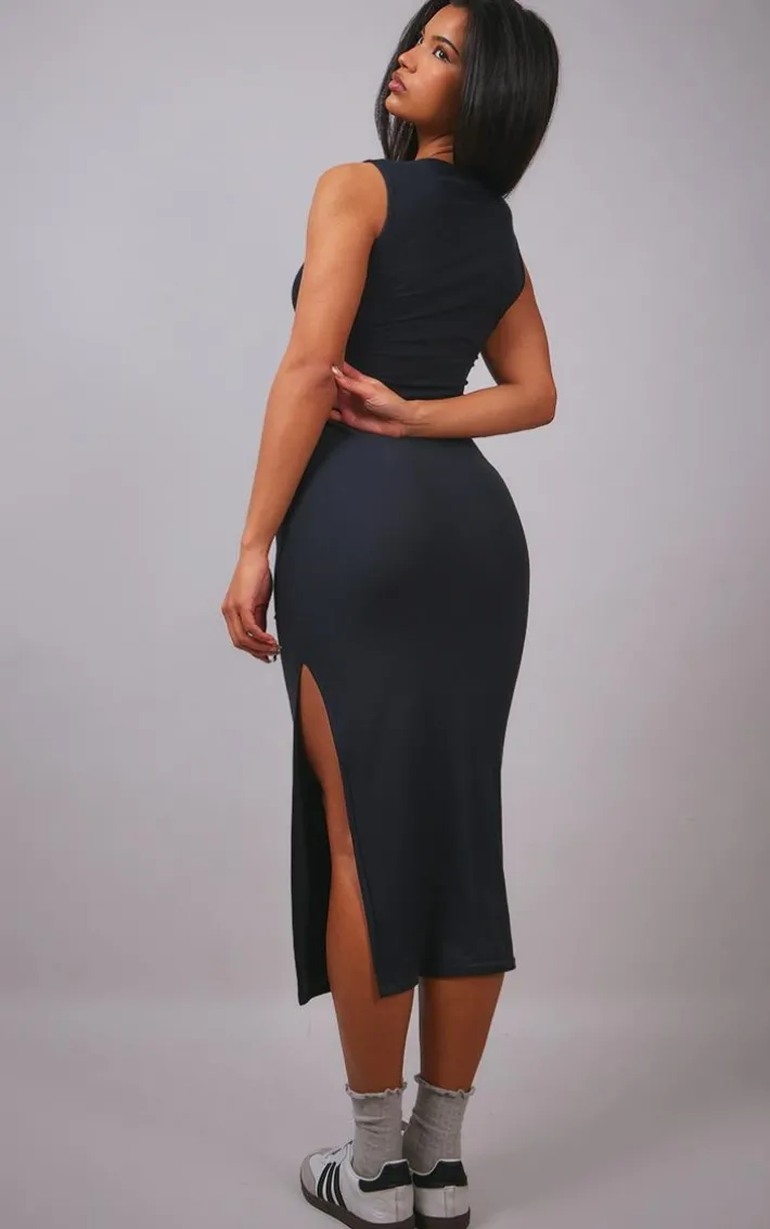 Meet your new season wardrobe essential with this black soft touch racer neck sleeveless midaxi dress. It is made using a black soft touch material with a racer design and a sleeveless style, you’re sure to be earning all the likes. Pair with sneakers, a faux leather jacket and a cap for a look that will have you nailing major trends.