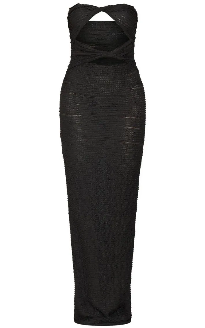 Go for all the effortlessly luxe vibes this season with this black textured bandeau twist cut out maxi dress, you won’t be able to resist. This dress features a black textured material with a cut out design and a twist detail, how could you say no? Style this textured dress with strappy sandals and gold accessories for a fool proof finish.