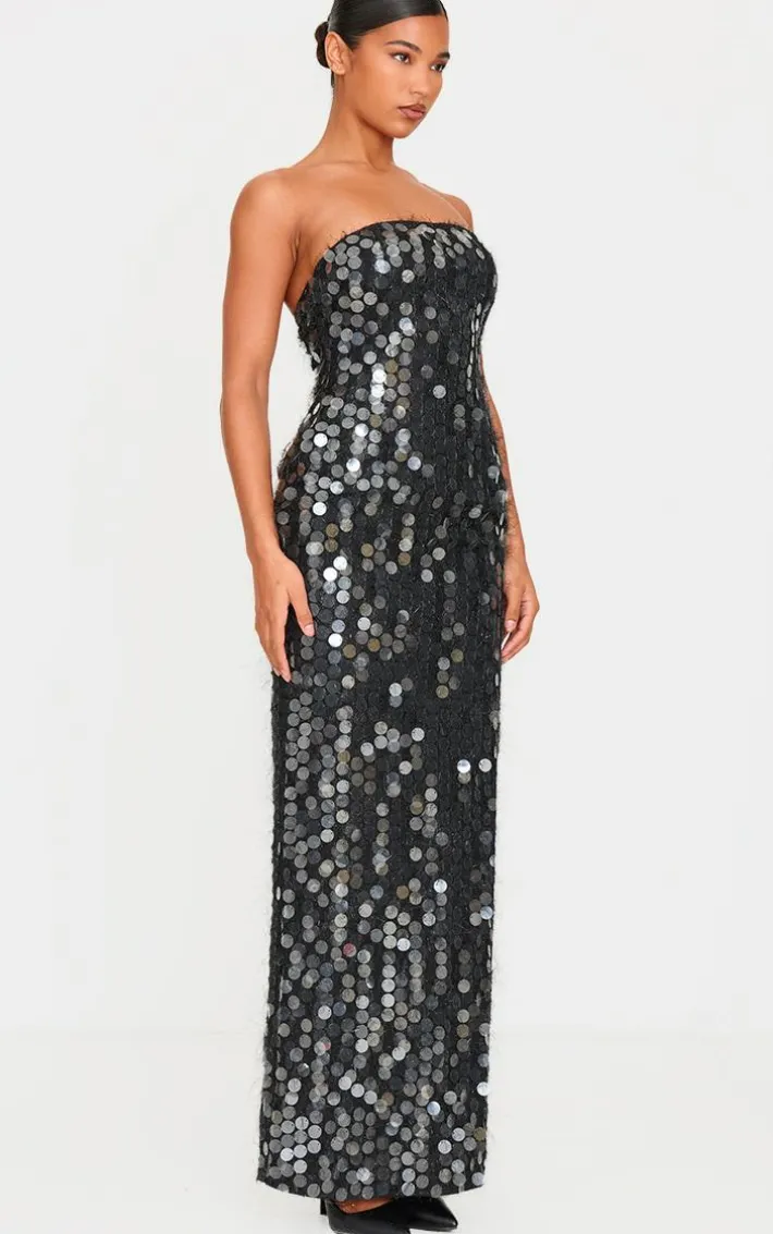 This black textured disk sequin maxi dress has just made styling easy. Brought to you in a chic black shade, with a statement textured disk sequin design and bandeau fit, this dress is sure to give a figure-flattering finish. Pair with simple accessories and black stiletto heels for a finished look we can’t get enough of.