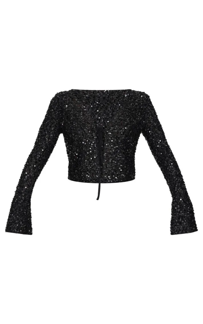 Meet your new essential for events season with this black textured sequin tie top, perfect for your weekend plans. Brought to you in a black hue textured material with a sequin design and tie front fastening, this top is a must have. How can you resist? For a look that will get you noticed, style with the matching hot pants, strappy heels and gold accessories.