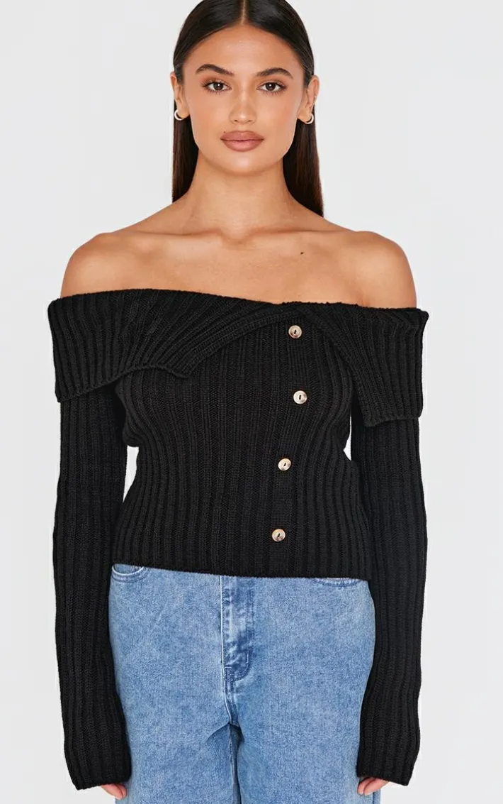 Keep it cosy with this black thick rib bardot foldover button up top. Brought to you in a black thick rib material with a bardot foldover design and a button up fastening, what more could you want? Team with your fave accessories and sneakers for a look that will have you setting major trends no matter what.