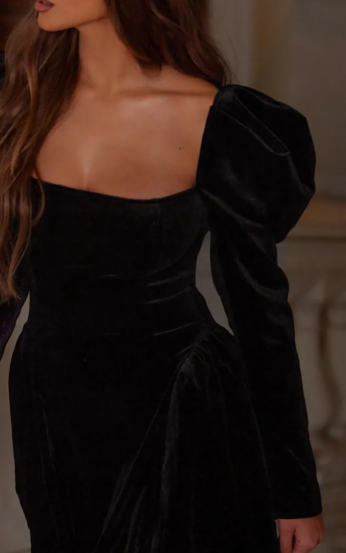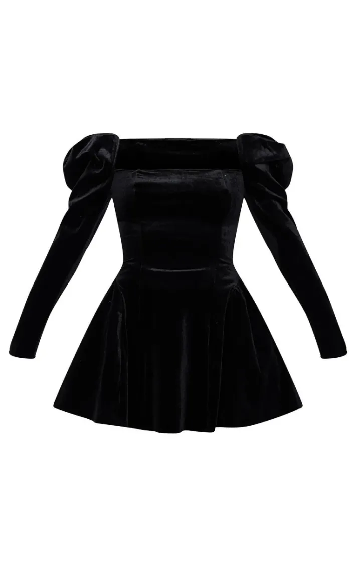 Enter the new season in style with this black velvet extreme puff sleeve skater dress. Brought to you in a must have black hue, with a luxe velvet material and an extreme puff sleeve design, you won’t be blending into the crowd. Team with a pair of heels and some gold accessories for a chic finish.