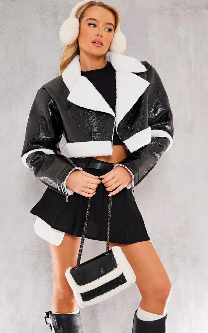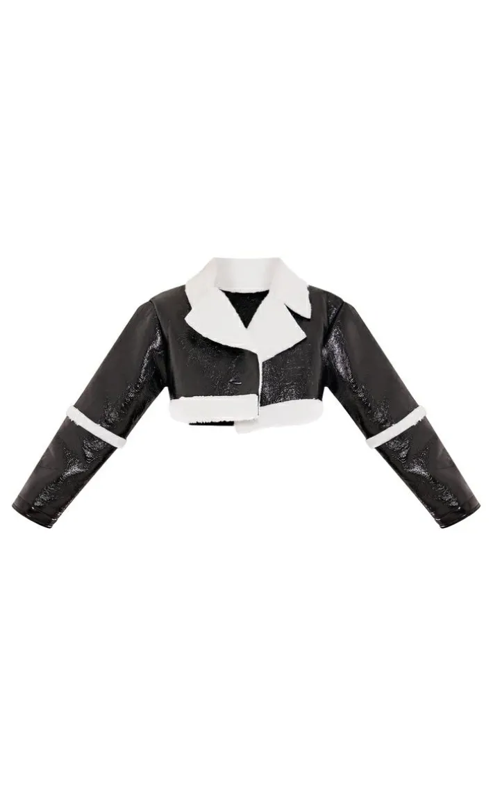 Take your outfit of the day that extra mile with this black vinyl borg cropped coat, you’re sure to be nailing major trends. This coat includes a black vinyl material with borg detailing and a cropped length, it’s a definite yes from us. Pair this vinyl coat with a mini skirt, chunky knee high boots and some ear muffs to elevate the look further.