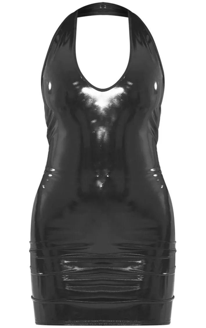 This black vinyl halterneck bodycon mini dress is sure to add a little edge to your weekend wardrobe. Brought to you a black vinyl material with a halterneck style and a plunge neckline. We love this paired with simple accessories and tie-up heels for a night out.