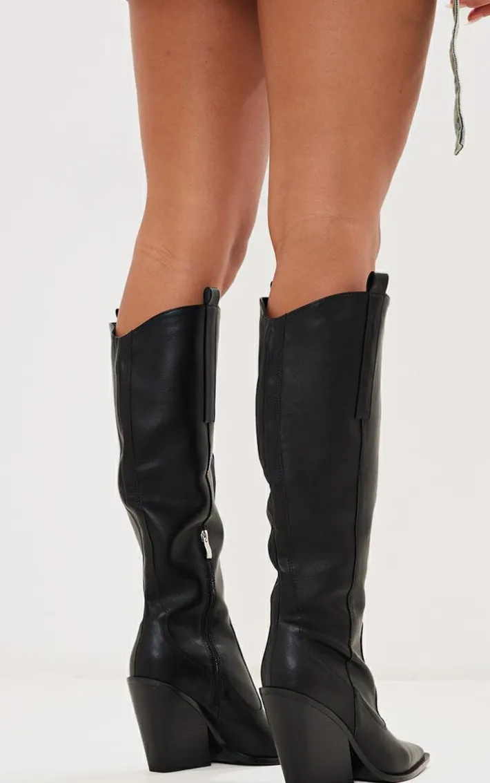 Step up your style game with these black western pointed wedge-heeled knee boots. Their black PU material makes them the ultimate styling piece whilst their western design adds that extra edge to your look. These boots have a wedge heel and knee-high length which are sure to elevate your vibe. Team with a full denim ‘fit for a vibe everyone will want.