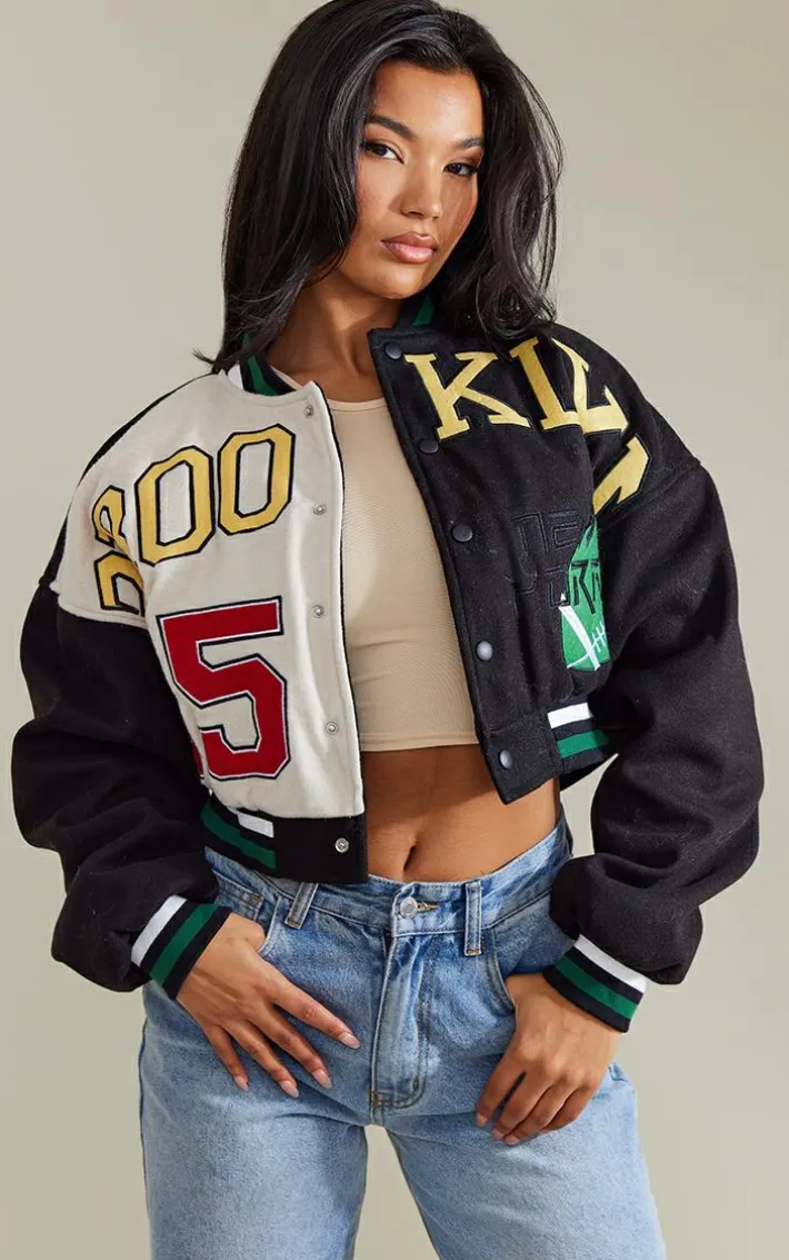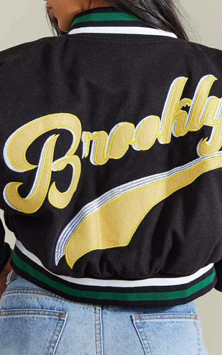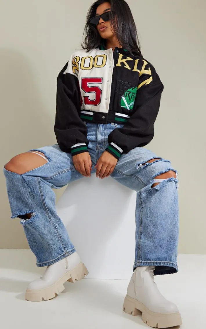 This jacket is perfect for effortless off-duty styling. Featuring a black wool look material with a graphic front design and a cropped length. Team with blue jeans and chunky boots for a fresh finish.