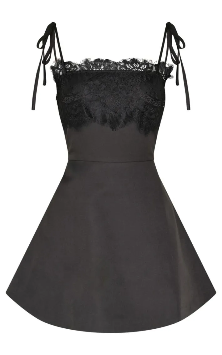 Say hello to your new season staple with this black woven lace detail tie strap A line shift dress. Brought to you in a black woven material with a lace detail, a tie strap and an A line design, what more could you want? Team this shift dress with a pair of heels and gold accessories to set major trends this season and beyond.