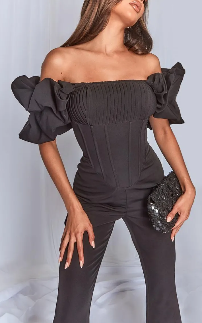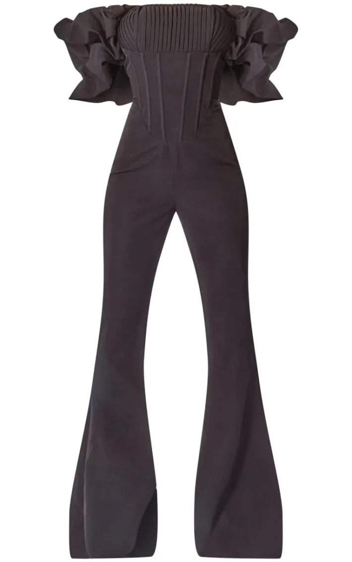 Be the best dressed for any event in this black woven pleated corset detail bardot frill jumpsuit. Brought to you in a black woven material with a pleated corset detail and a bardot frill neckline, what’s not to love? Style this unreal jumpsuit with heels and gold accessories to make a statement this season.