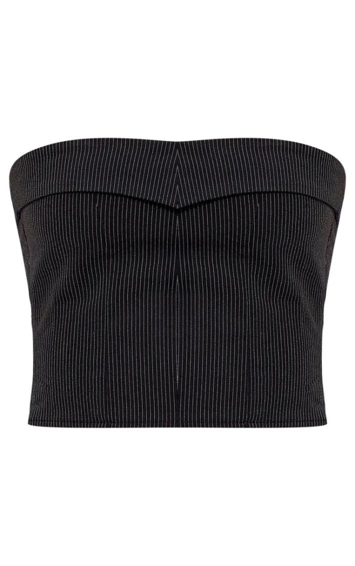Say hello to your new season staple with this black woven tailored asymmetric pinstripe bandeau top. Brought to you in a black woven material with an asymmetric design and a tailored fit, how could you say no? Style effortlessly with the matching top, high heels and accessories for a look that will turn heads for all the right reasons.