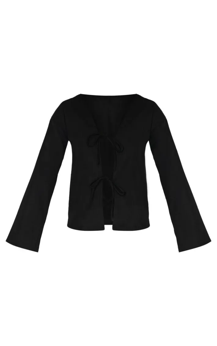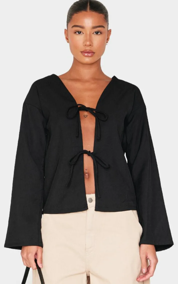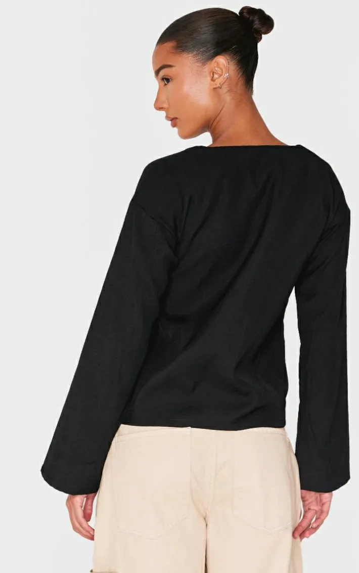 Tap into your confident side with this black woven tie front flared sleeve shirt. Brought to you in a black woven material with a tie front and a flared sleeve design, we are obsessed. Team with a pair of pants and your fave bag for a look you can take from day to night instantly, it’s a yes from us.
