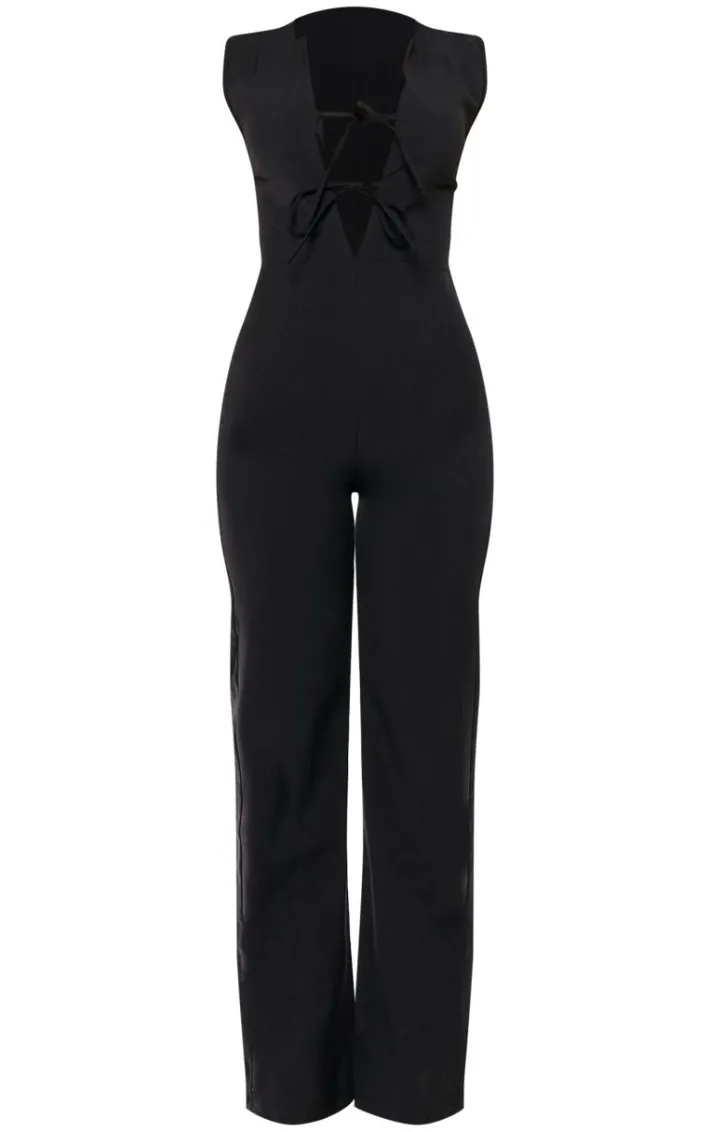 Own the night in this black woven tie front tailored jumpsuit. Brought to you in a black woven material with a tie front and a tailored fit, you are sure to turn heads and tap into your confident side in this dreamy piece. Its versatile style is sure to make you the center of attention no matter what. Style the look with heels and statement accessories to earn that best dressed title.