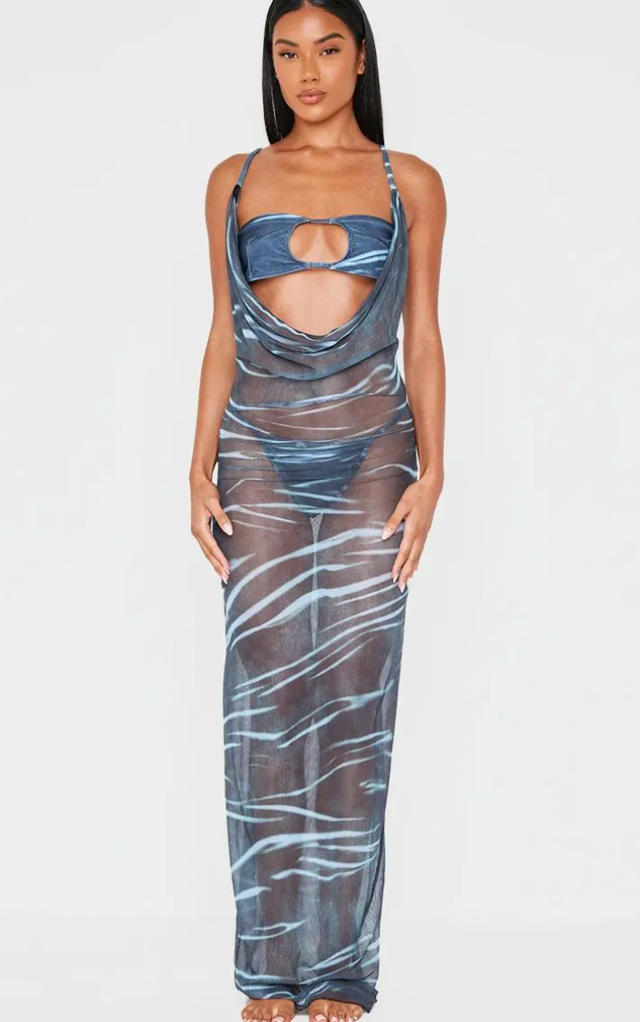 Elevate your holiday style with this blue abstract print deep plunge maxi beach dress. Brought to you in a statement blue shade, with a luxe abstract print design, flattering deep plunge neckline and maxi length, this beach dress is a must have. Team with a pair of sandals and matching bikini to really complete the look.