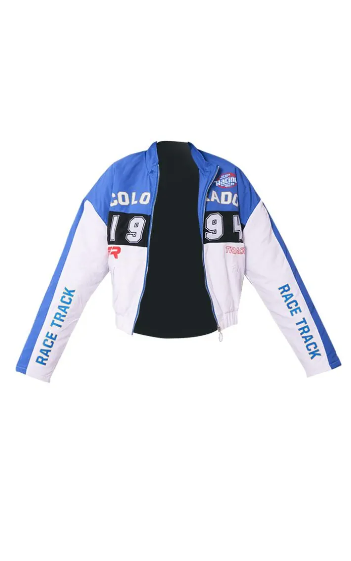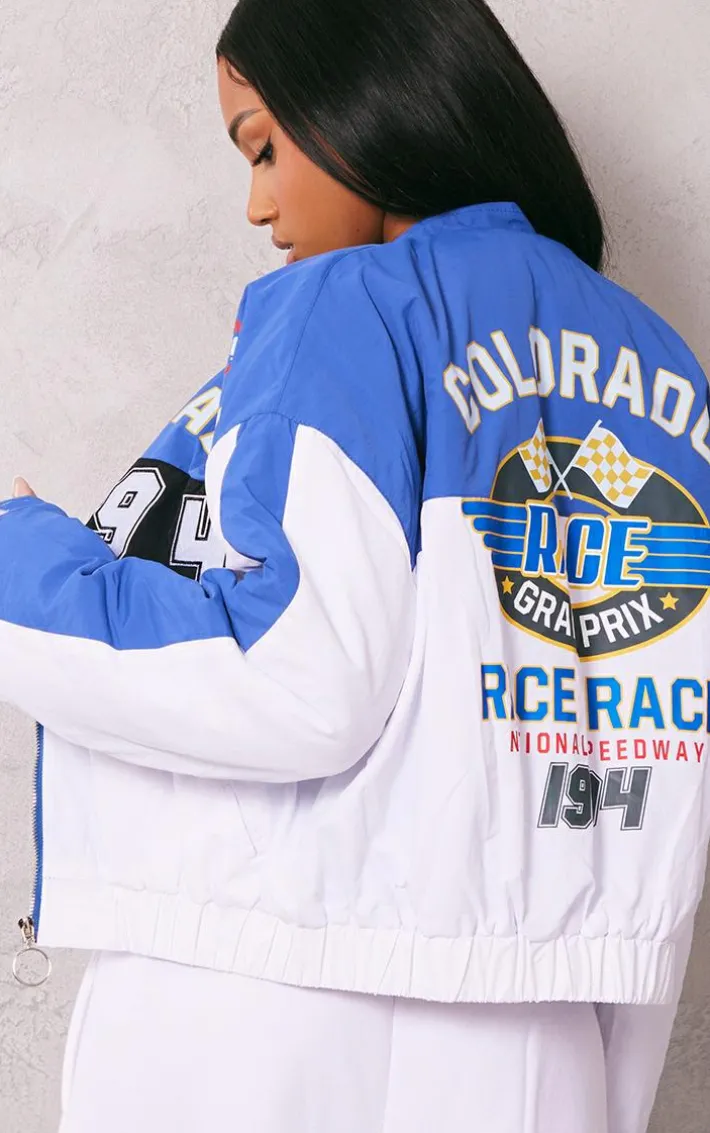 Give your A/W wardrobe the refresh it needs with this blue and white oversized graphic zipper racer bomber jacket. This bomber jacket is brought to you in a blue and white hue material with an oversized fit and a zip-up front, we can’t get enough. This bomber jacket is sure to elevate any look. So what are you waiting for? Style this over your outfit of the day to take the look from 0-100 instantly.