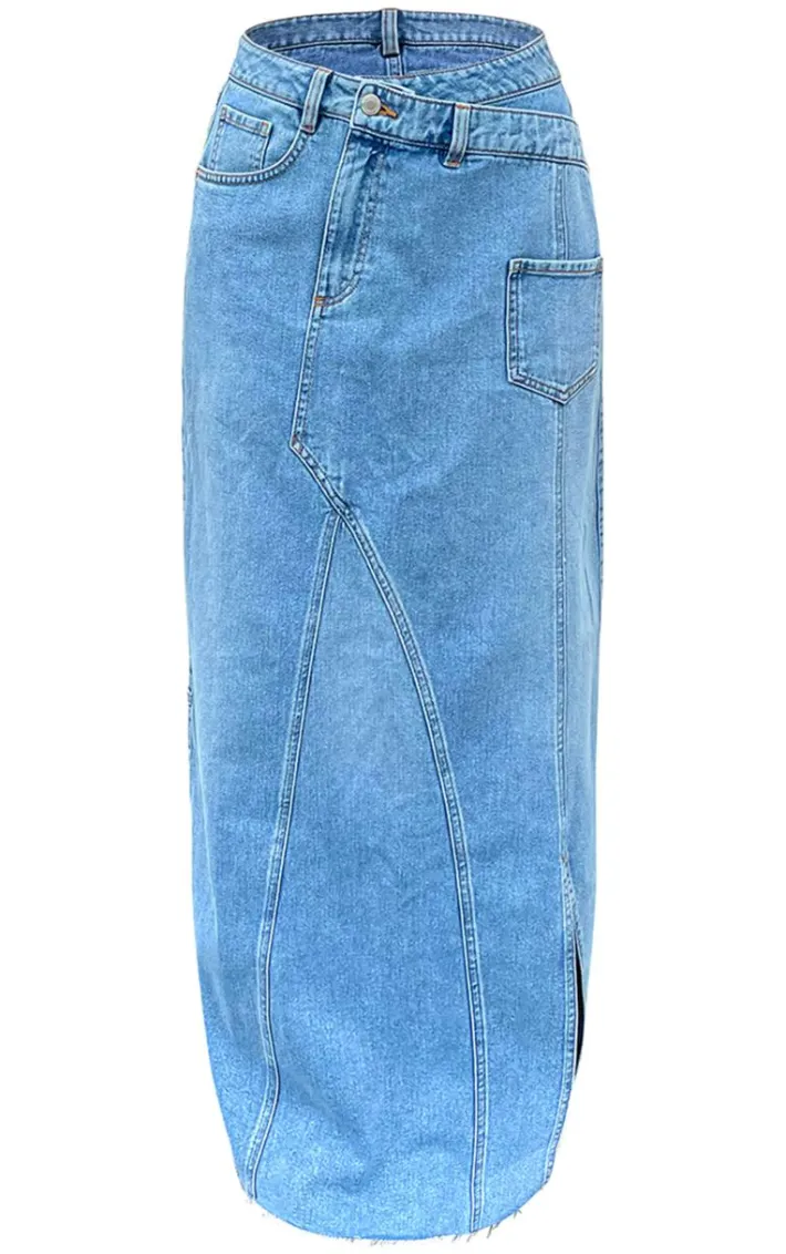 Enter the new season in style with this blue asymmetric waistband seam detail denim maxi skirt. Brought to you in a blue denim material with an asymmetric waistband design, seam detailing and a maxi fit, how can you say no? Style this maxi skirt with a top, sneakers and simple gold accessories for a look that is sure to make heads turn for all the right reasons.