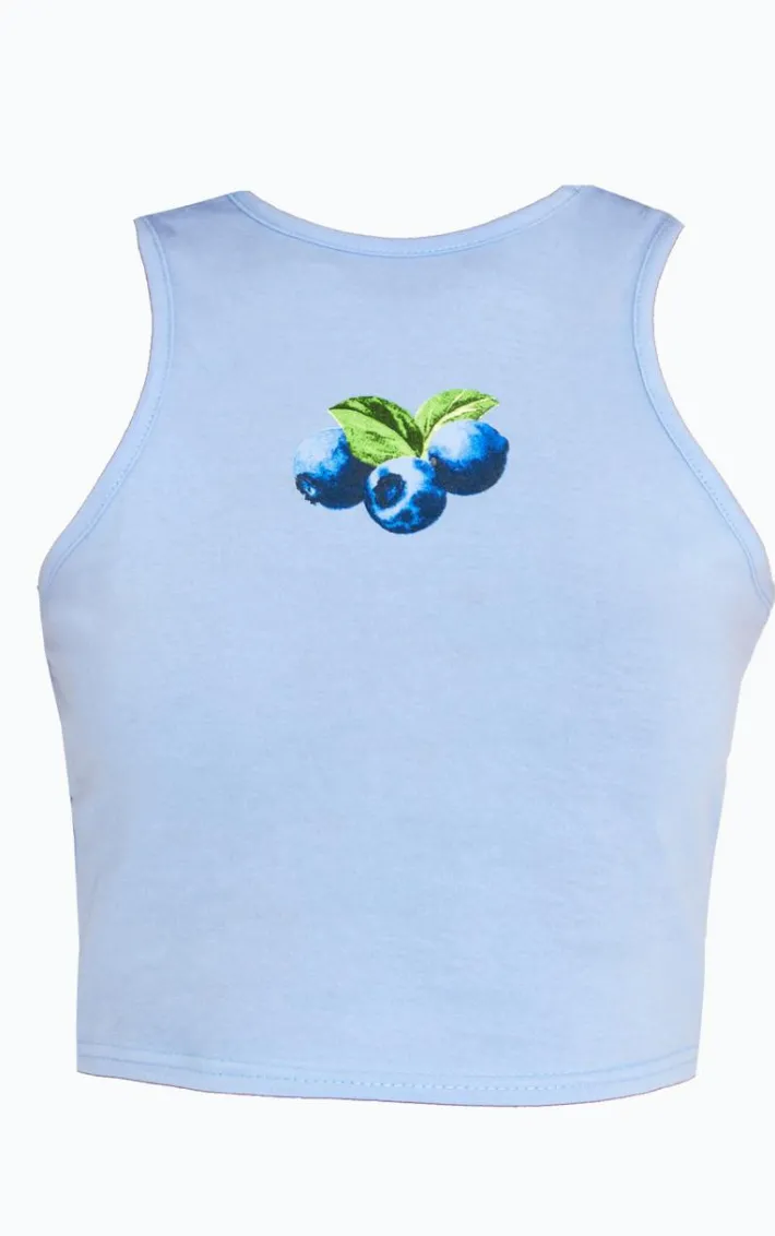 Amp up your tops game this season with this blue blueberry graphic detail racer vest top. Brought to you in a blue hue material with a blueberry graphic detail and racer vest design, this top is calling your name. Style with white shorts, western boots and gold accessories for a look that won’t miss.