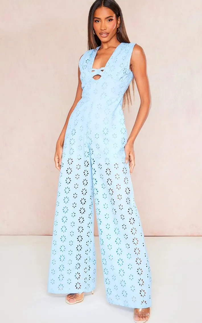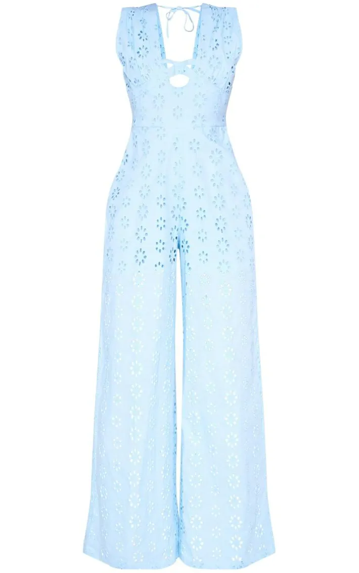 Add a touch of glam into your new season wardrobe with this blue broderie anglaise tie bust sleeveless jumpsuit, it is everything we are loving for your next big occasion and beyond. This jumpsuit is made using a blue broderie anglaise material with a tie bust design and a sleeveless style, how could you resist? Style this blue jumpsuit with your highest heels and gold accessories for a look no one will forget.
