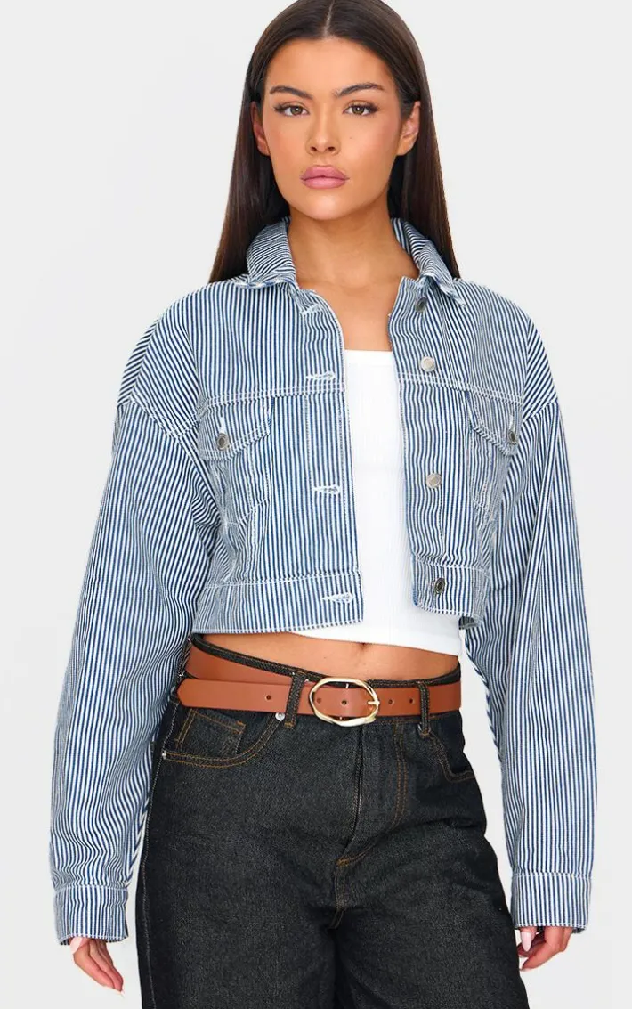 Get ready to earn some serious style points in this blue cropped pinstripe denim jacket. Brought to you in a blue hue denim material with a pinstripe design and a button fastening, what’s not to love? Pair this denim jacket with the matching jeans, a white top and ballet flats for a look that won’t go unnoticed.