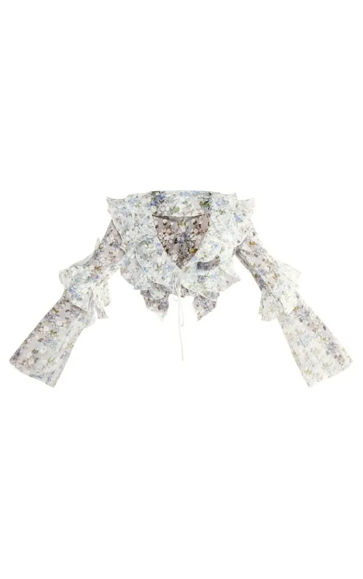 Add some drama into your weekend wardrobe with this blue floral sheer woven ruffle tie crop blouse. Brought to you in a blue sheer woven material with a floral design, we are seriously obsessed. With it’s ruffle detailing and cropped length, you’re sure to have all eyes on you. To complete the look style with a mini skirt and gold hoops for a date night look.