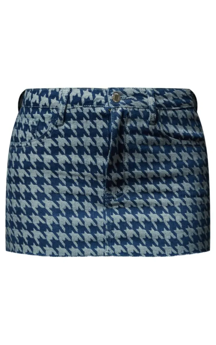 Add some seriously chic vibes to your new season wardrobe with this skirt. Featuring a blue houndstooth print denim material with a raw hem design and a mini length. Wear with the matching top and your highest heels to have all eyes on you.