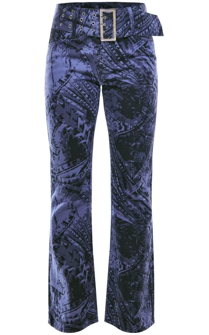 You are sure to stand out from the crowd with these blue jean print flared jeans. They are sure to elevate your look. Made using a blue hue jean print material with a flared leg and a figure flattering fit that will show off your unreal shape, what more could you ask for? Wear with the matching hue top, accessories and clear heels for a vibe that will get everyone talking.