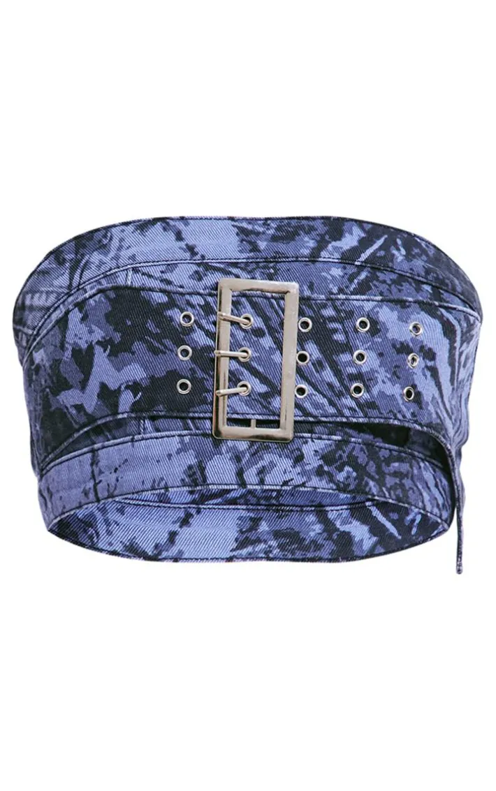 Channel all the edgy vibes with this blue jeans print denim belted crop top. Brought to you in a blue denim print material with a belted design and a cropped length, how could you resist? This crop top will have heads turn for all the right reasons. Pair effortlessly with the matching mini skirt, high heels and accessories for a look like no other.