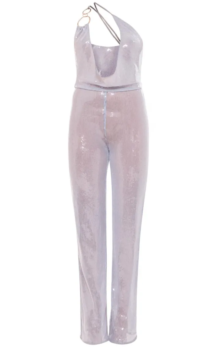 Make them stop and stare in this blue sequin cowl neck ring detail jumpsuit, we just can’t get enough. This jumpsuit features a blue sequin material with a cowl neck design and ring detailing. Style this jumpsuit with clear slip-on heels and a clutch bag for a look no one will forget.