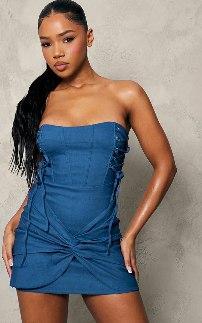 Be the best dressed in every room with this blue stretch woven bandeau lace up corset bodycon dress. Brought to you in a blue stretch woven material with a bandeau design, we are obsessed. Its lace up fastening and corset detail will have you showing off your shape in all the right places. Team this unreal bodycon dress with a pair of clear heels and your go-to accessories to finish off the look.