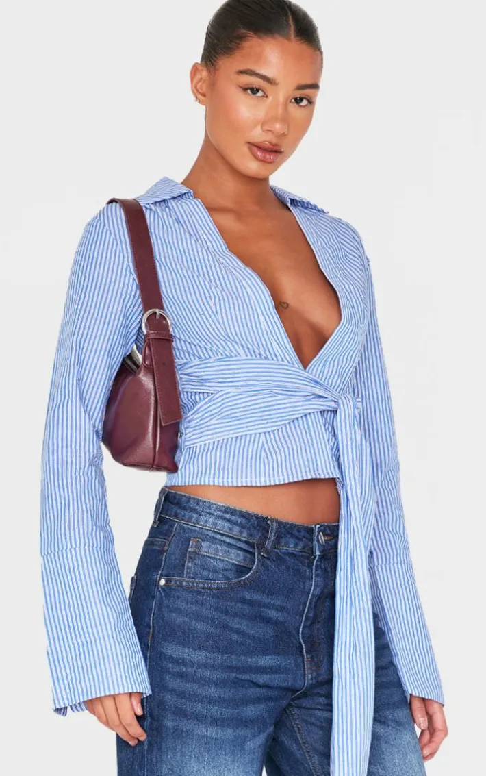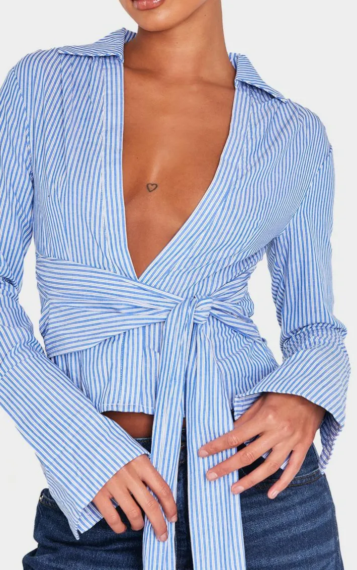 Elevate your next weekend look with this blue striped cinched tie waist shirt. Brought to you in a blue hue material with a striped design, cinched detail and tie waist fastening, this shirt is all the new you need. Style with blue jeans, slip on heels and a burgundy bag for an on-trend look perfect for those plans you said yes to.