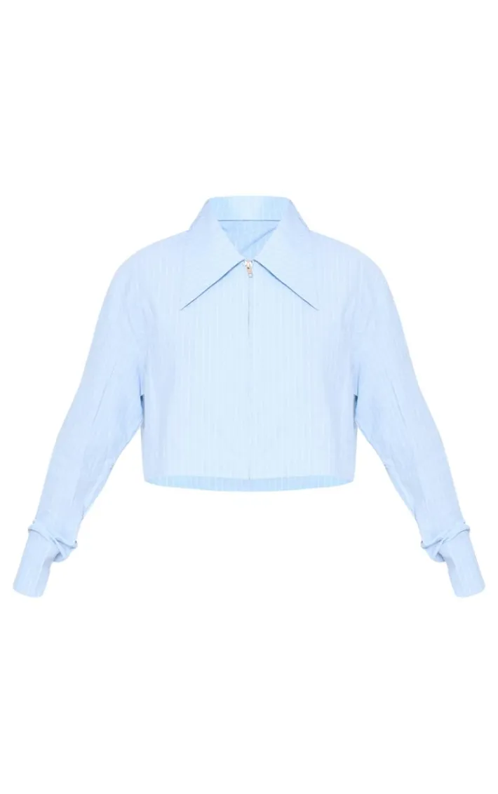 Switch up your new season style game with this blue striped zip up cropped shirt. Brought to you in a blue hue striped material with a zip up design and a cropped fit, what more could you want? Team this blue shirt with a mini skirt and boots for a look that is sure to earn you some serious style points.