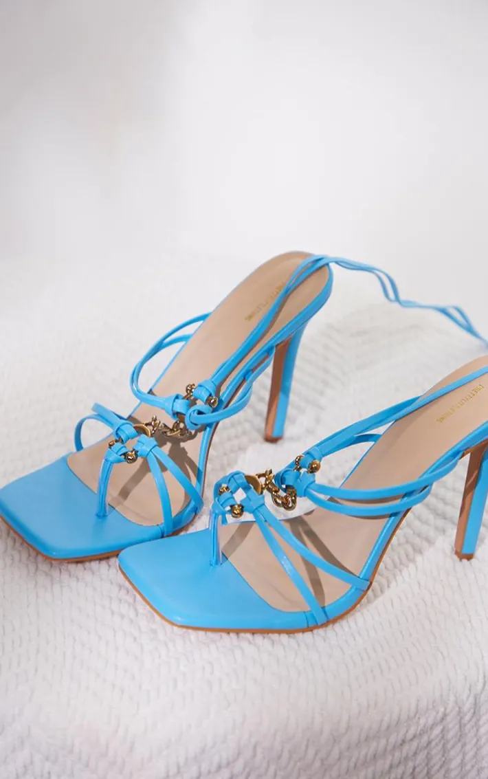 These heeled sandals are your weekend essential. Featuring a blue PU material with tie-up straps, a toe thong design and a high heel, what’s not to love? They’re a must-have this season.