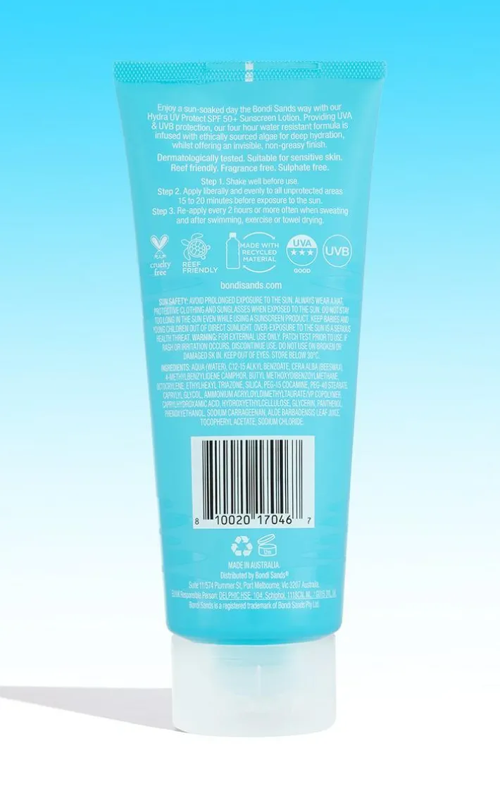 Enjoy a sun-soaked day the Bondi Sands way with our Hydra UV Protect SPF 50+ Sunscreen Lotion. Providing UVA & UVB protection, our four hour water resistant formula is infused with ethically sourced algae for deep hydration, whilst offering an invisible, non-greasy finish.