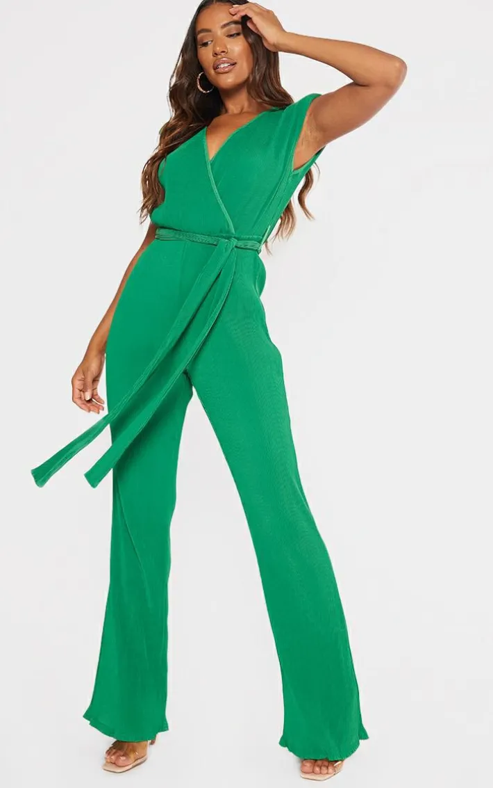 This jumpsuit is everything we’re currently vibing. Featuring a bright green material with pleated shoulder pad detailing and flared legs, style this with heels and simple accessories for a look we’re loving.