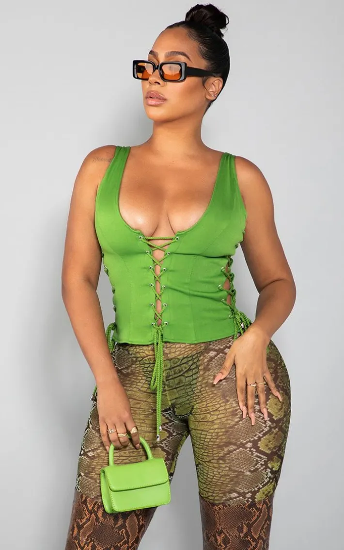 Nail new season trends with this top. Featuring a bright green woven material with lace-up detail and a plunge neckline, we’re obsessed. Style with light wash jeans and heels for a date.