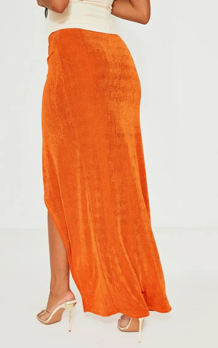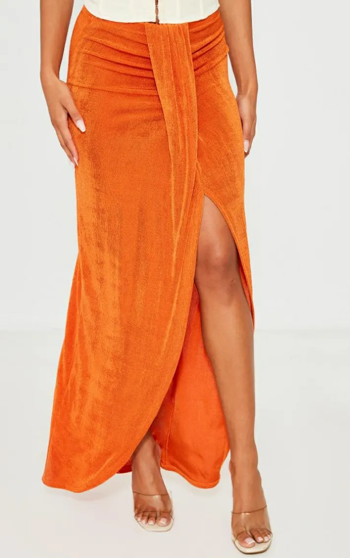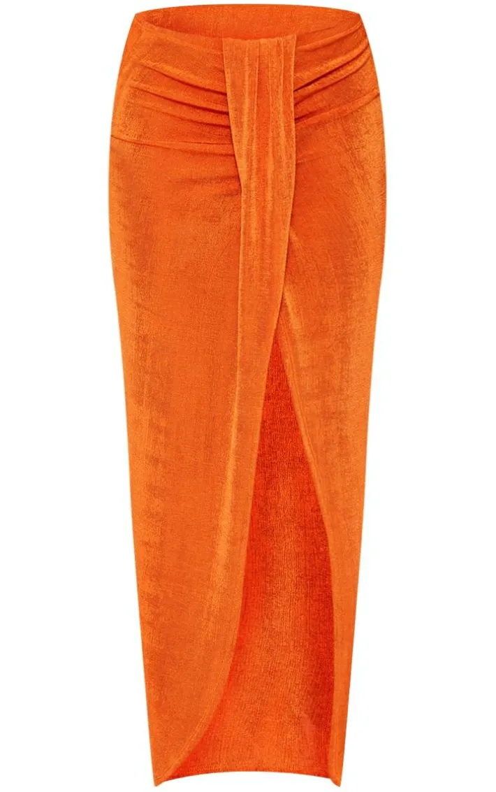 Add a pop of orange into your weekend wardrobe with this bright orange acetate slinky drape front maxi skirt. This skirt is brought to you in a bright orange slinky material with a drape front and a maxi length, what’s not to love? This maxi skirt is everything and more we’re loving paired with a white corset, high heels and accessories for a flawless finish.
