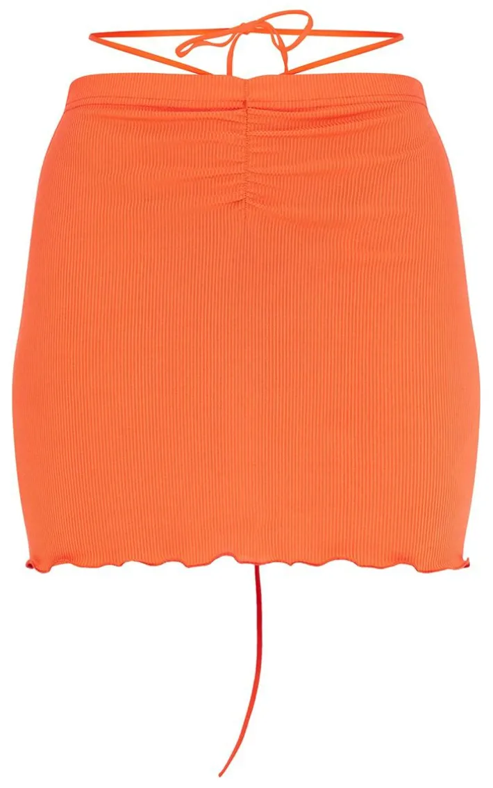 Add some of this seasons must-have hues into your weekend wardrobe with this skirt. Featuring a bright orange ribbed material with a tie waist and a frill edge in a mini skirt style, how could you resist? Just add a pink crop top and mules for a feminine feel.