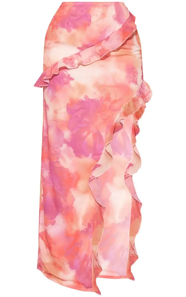 Look all kinds of glam for that special occasion in this bright pink chiffon floral print ruffle maxi skirt. It’s here to solve all your what-to-wear-dilemmas. This skirt is brought to you in a bright pink chiffon material with a floral print and ruffle detailing, what more could you want? Style this chiffon skirt with the matching top, tie-up heels and your fave accessories for a look everyone will remember.