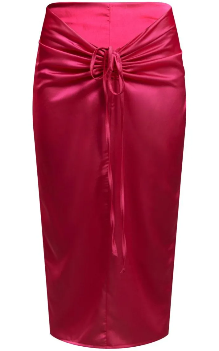 Have you got an important event pencilled into your diary? Then this bright pink satin ruched v front detail midaxi skirt is for you. Brought to you in a bright pink satin material that will have you tapping into your luxe side. With a ruched v front detail and a midaxi length, you will have heads tuning no matter what. Simply style with the matching crop top and some of your highest heels to elevate the look even further, we are obsessed.