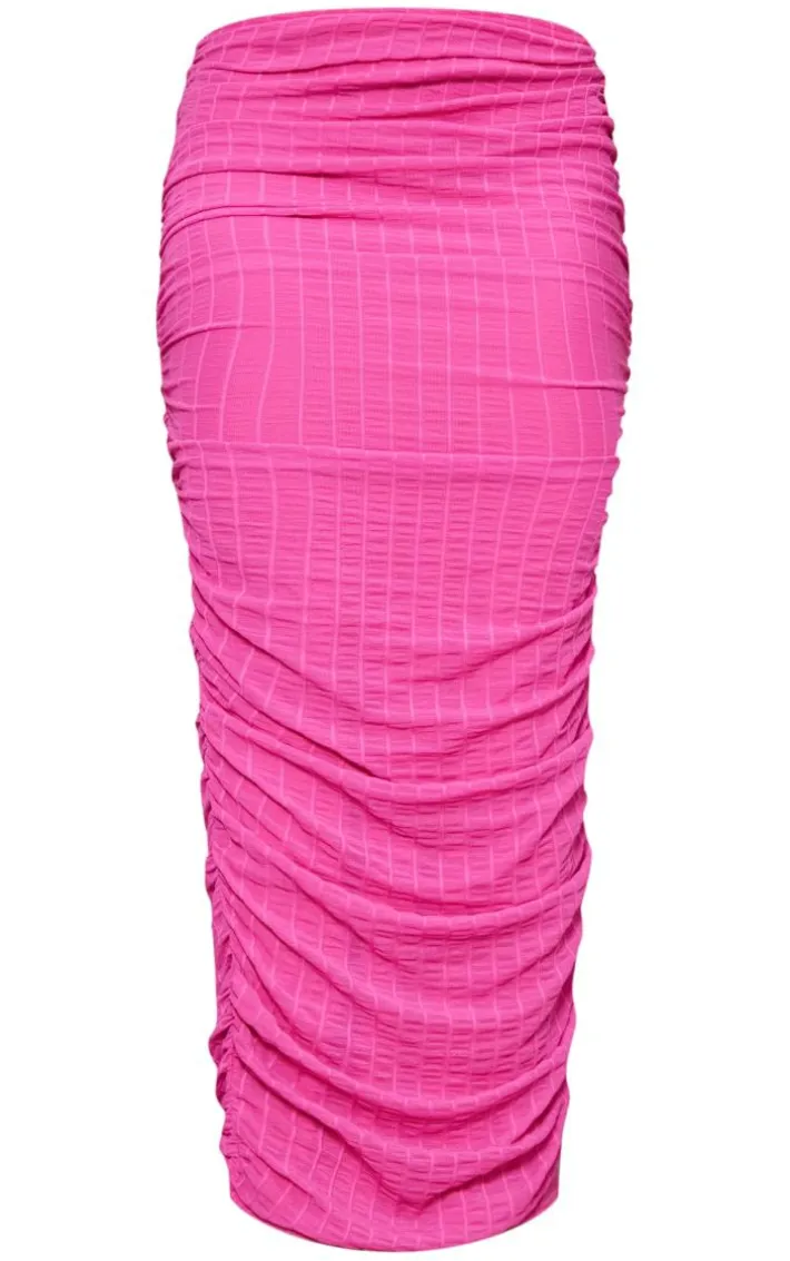 Channel all the fierce vibes into your new season wardrobe with this bright pink textured mesh ruched low rise midaxi skirt. Whether you’ve got plans for the weekend or want to elevate your everyday look, this midaxi skirt is sure to be at the top of your hit list. It features a bright pink textured mesh material with ruched detailing and a low rise design, what’s not to love? Pair this midaxi skirt with the matching top, clear slip-on heels and your fave accessories for a look that will bring all the drama.