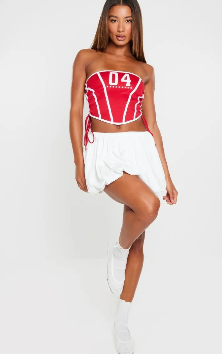 Show your support in style next game day in this bright red 04 printed lace up side corset. With a side tie feature and bold red color, you’ll be turning heads for all the right reasons. Finish off the look with a black or white puff ball skirt and slip on shoes for a simple but matchy-matchy vibe.