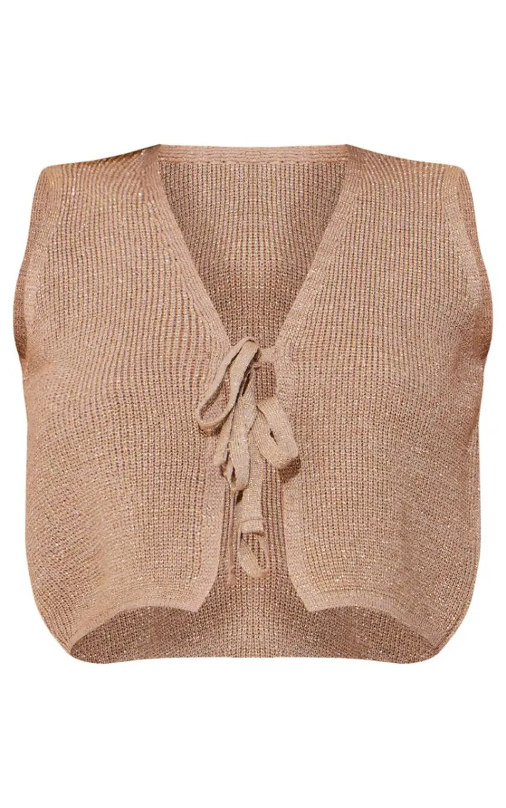 You are guaranteed to steal all the stares in this bronze glitter knit double tie front vest. Brought to you in a bronze glitter knit material with a tie front, how can you resist? This vest is perfect for your next occasion. Just add bottoms, your highest heels and some glam accessories to take the look to a whole new level.