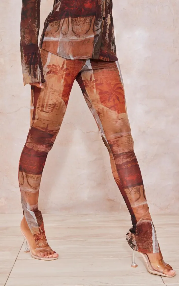 Take your weekend wardrobe to new heights with these brown abstract printed mesh leggings, get ready to have heads turning for all the right reasons. Made using a brown mesh material with an abstract print design and a figure-worshipping fit, you’ll be adding these leggings straight to your basket. Team these mesh leggings with the matching shirt, your fave heels and gold hoop earrings for a fierce finish.