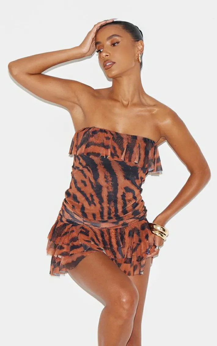For a new season statement, opt for this brown animal print bandeau frill hem mini dress. Brought to you in a brown animal print hue material with a bandeau neckline and frill hem detail, this mini dress is sure to have you feeling confident. Style with a pair of black heels and gold accessories for a finish we can’t take our eyes off.
