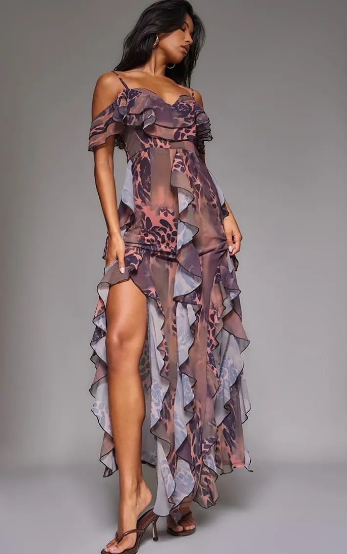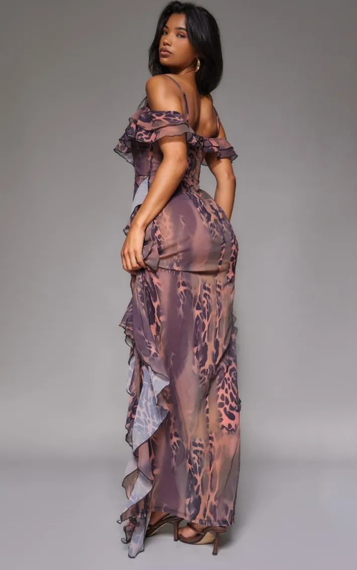 Inject some of this season’s must have trends into your weekend wardrobe with this brown animal print cold shoulder ruffle detail maxi dress. Brought to you in a brown hue animal print material with a cold shoulder design and ruffle detail, this maxi dress is at the top of our wish list. We’re in love. Style with slip on heels and gold hoops for a fierce finish everyone will be asking about.