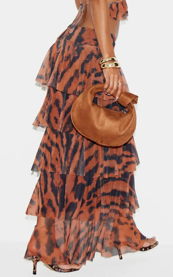 Say hello to this brown animal printed mesh rara maxi skirt. Brought to you in a brown animal printed mesh material with a rara design, this maxi skirt is sure to make a weekend statement. Style with the matching top, neutral heels and a chocolate shoulder bag for a look that won’t go unnoticed.