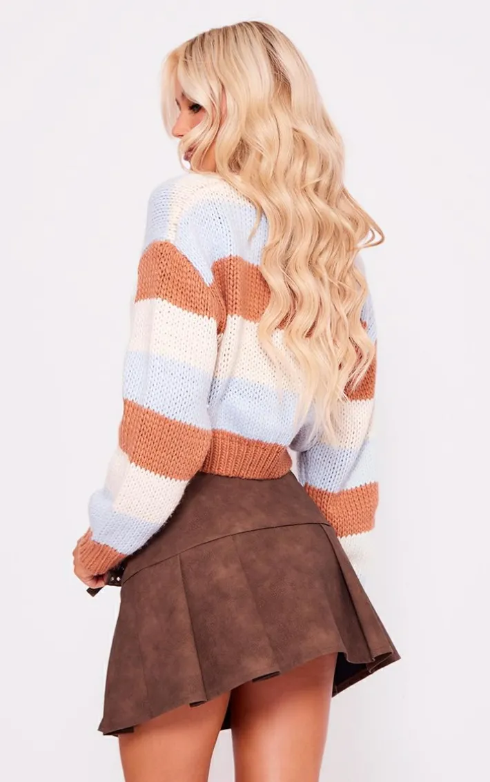 Get maxing out your knitwear collection with this brown chunky striped knit cropped sweater. Its brown chunky knit material features a striped design and cropped length which is sure to gain you all the compliments this season. Whatever your plans are, this sweater is that must-have essential you have been searching for. Team with a mini skirt, gold accessories and knee-high boots to set trends wherever you step foot.